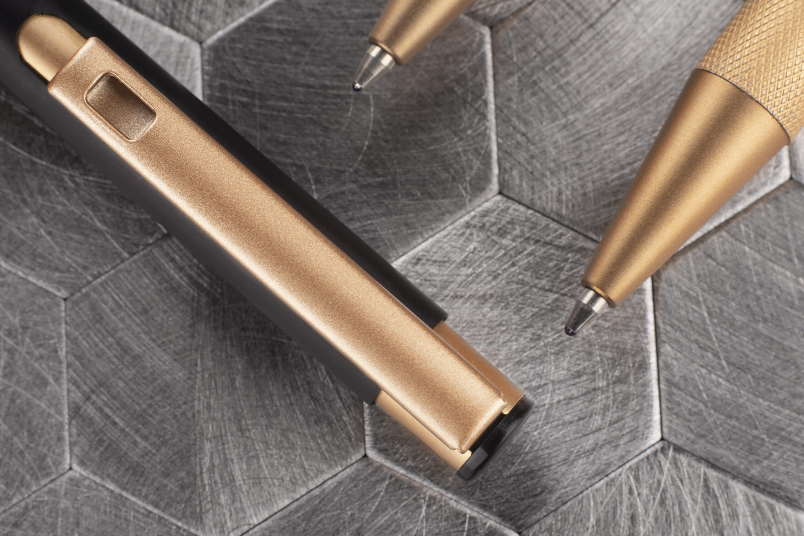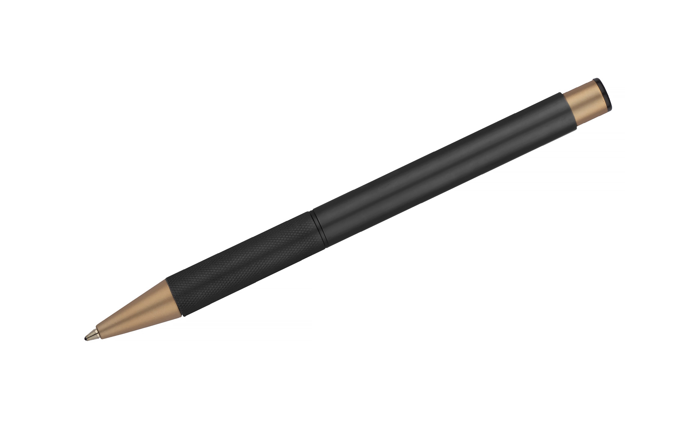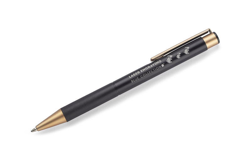 Elegant aluminum pen. Gold-coloured finishes. Blue semi-gel refill.