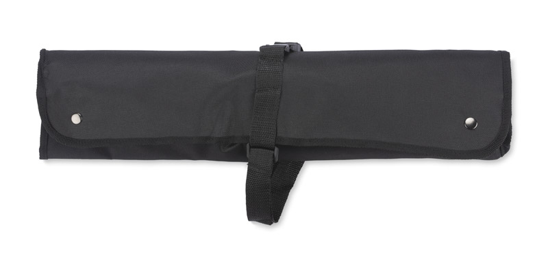 The barbecue set with glove and apron, which also functions as a case. The set contains the most necessary tools for barbecuing: tongs, forks and spatulas. The apron protects the clothing against stains, and the glove protects against burns.