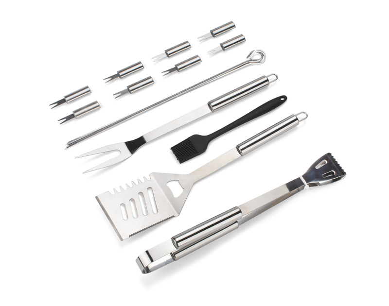 The ROLAN grill set in a polyester case contains 16 elements with steel handles: 4 skewers, tongs, a spatula with a bottle opener, a fork, 8 corn cob holders and a silicone brush.