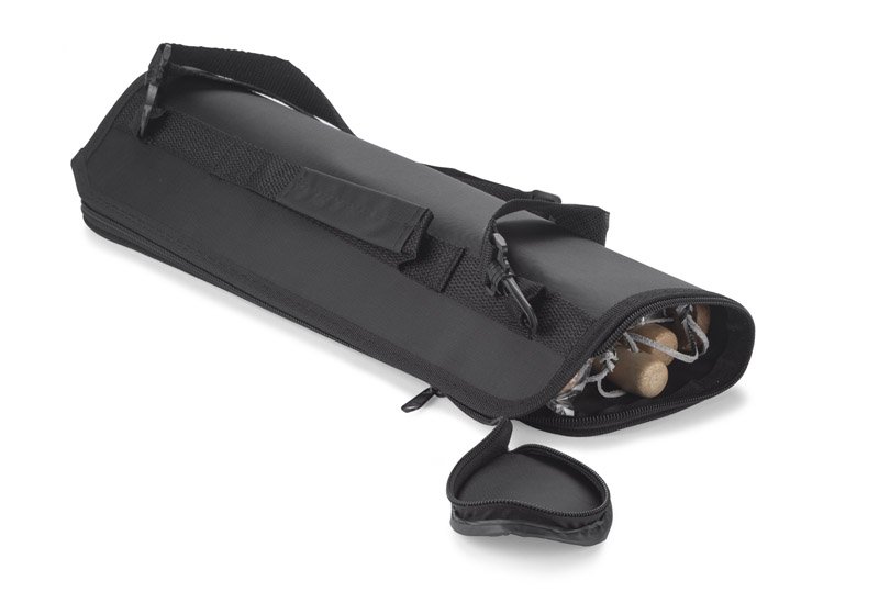 The RIVA grill set in a polyester case includes 10 elements with wooden handles: 2 skewers, tongs, spatula, a fork and 4 corn cob holders.