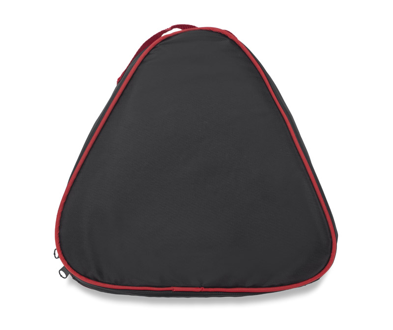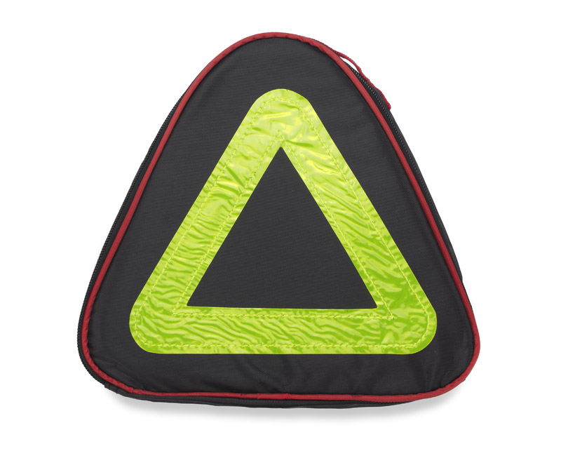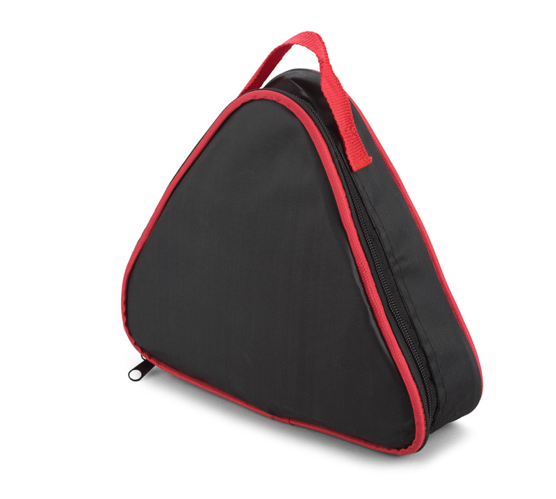 Car tools set packed in polyester bag which due to it shape can be used as warning triangle. Set contains: buster cables, instrument for measuring tire pressure, screwdrivers set and nuts, dynamo torch, tyre gauge, knife, gloves, rain coat. Logo can be made with screen printing method.