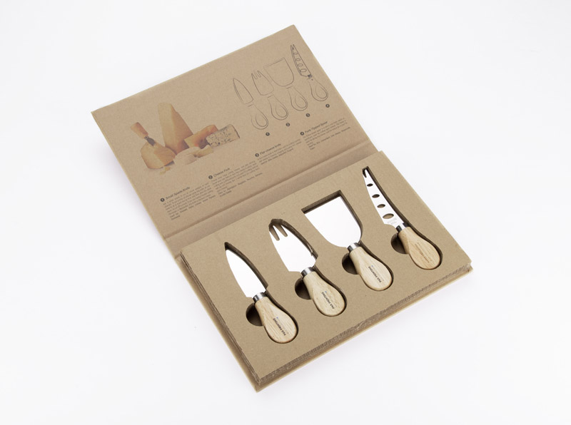 A set of 4 cheese knives packaged in a classic, well-made paper box. Inside the packaging is an infographic with a photo and description of what each knife is used for. This set is a perfect gift idea. The knives are made of stainless steel.