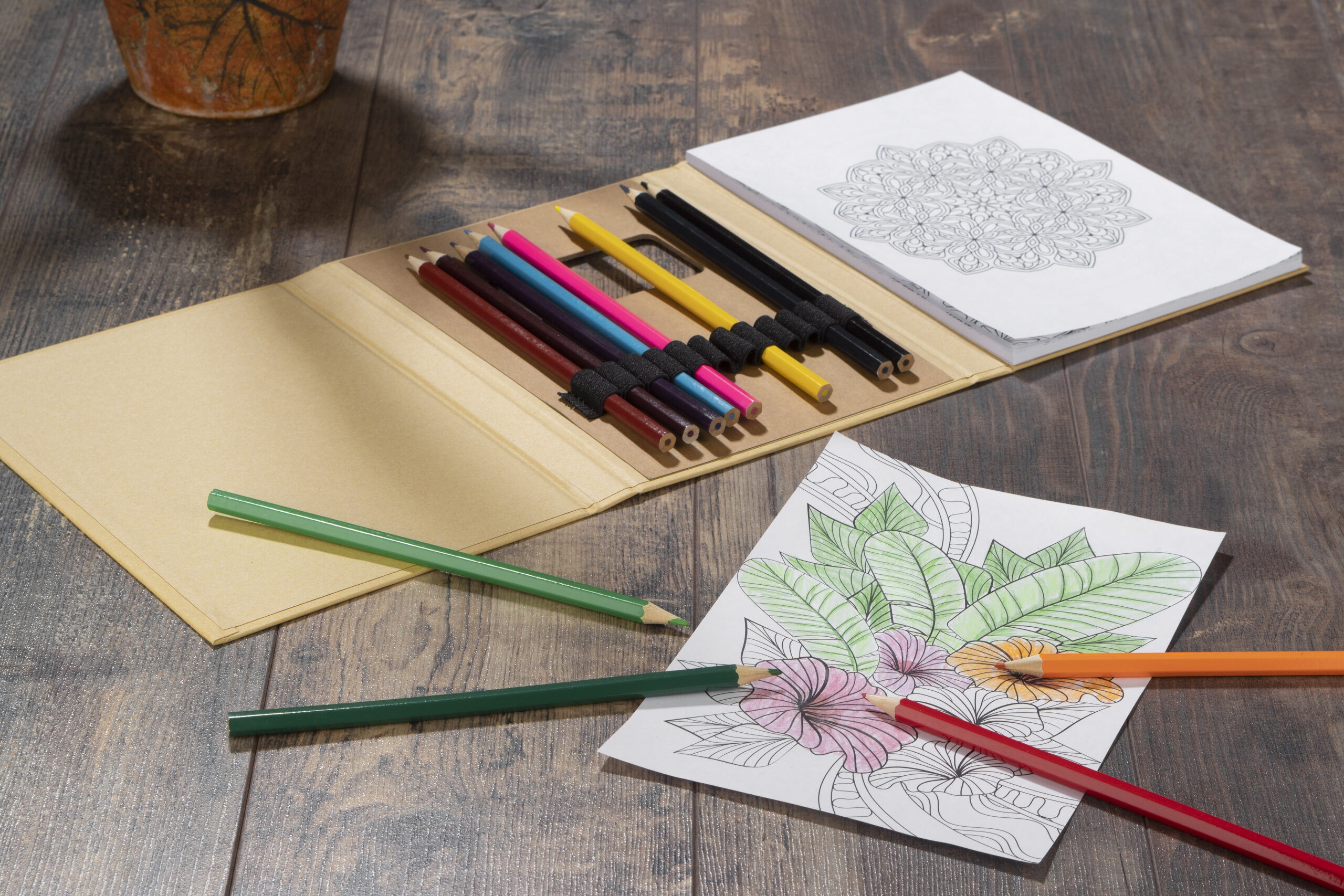 A practical coloring notebook in a kraft cover. Inside there are 10 coloring sheets, 40 plain sheets and 12 crayons.
