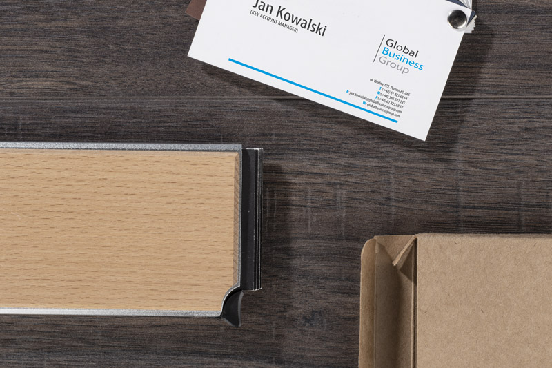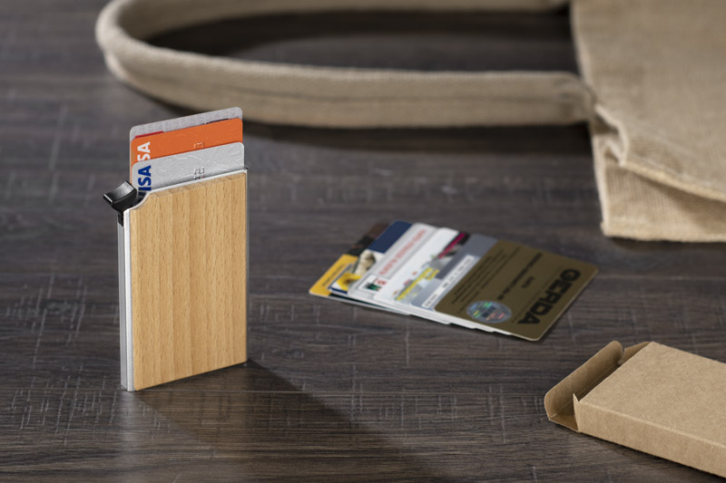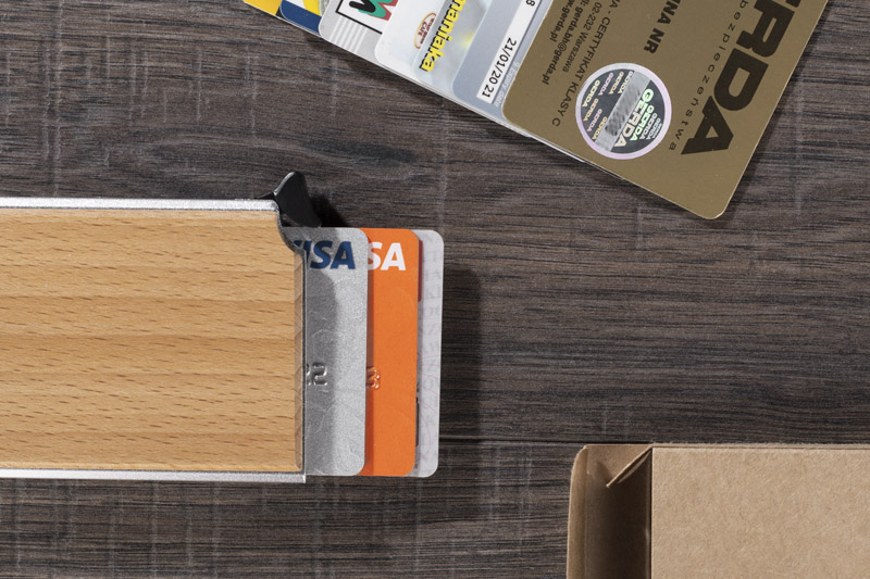 RENE is a practical gadget that facilitates the safe storage of credit cards. Thanks to the RFID function, it prevents data theft from payment cards. The case is made of aluminum with the addition of wood. It is a minimalist combination, very aesthetic and elegant. The case can hold 6 cards. Packed in a brown cardboard box.