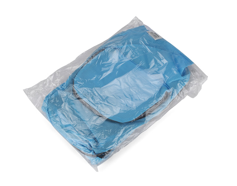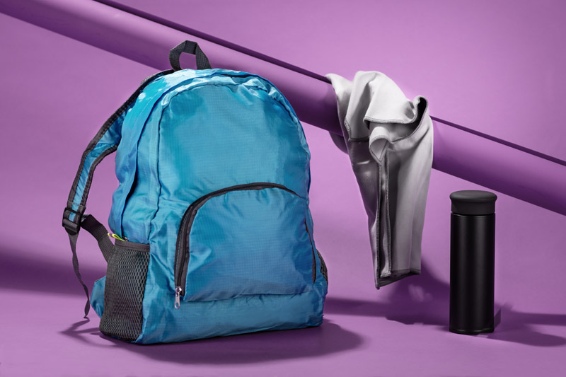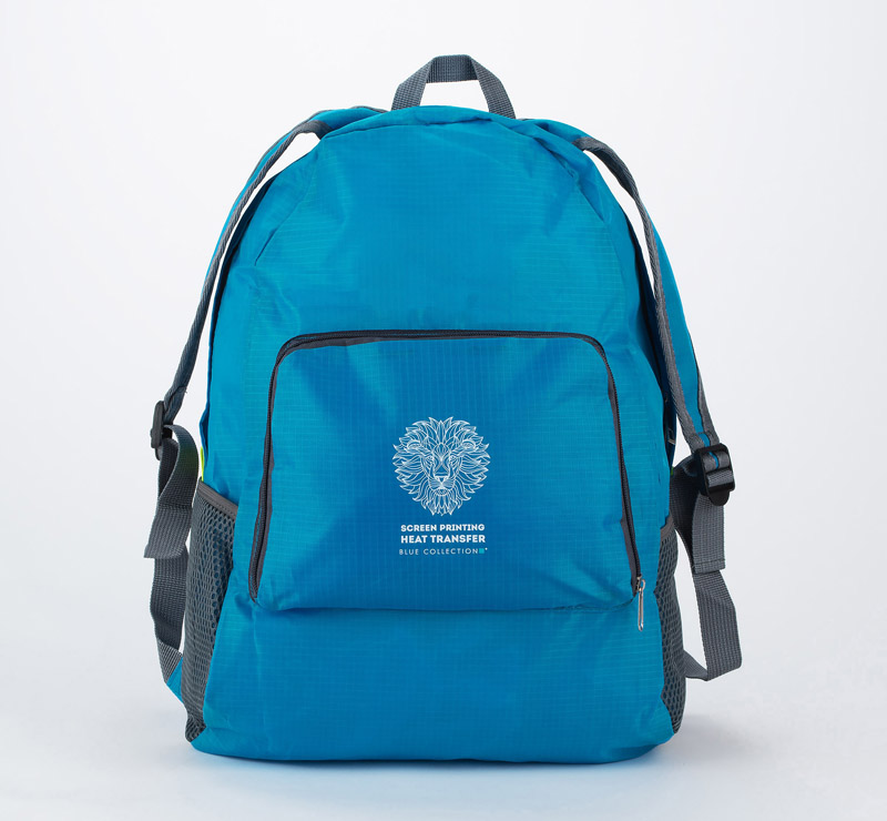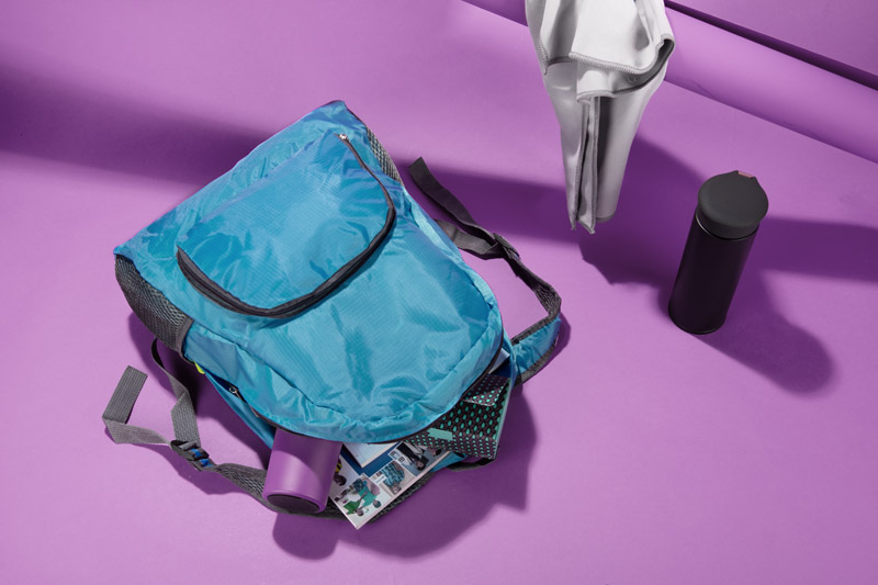 Functional backpack that can be folded to a compact size. It has one inner pocket and three external ones – one with a zipper and two with net. The backpack is made of polyester.