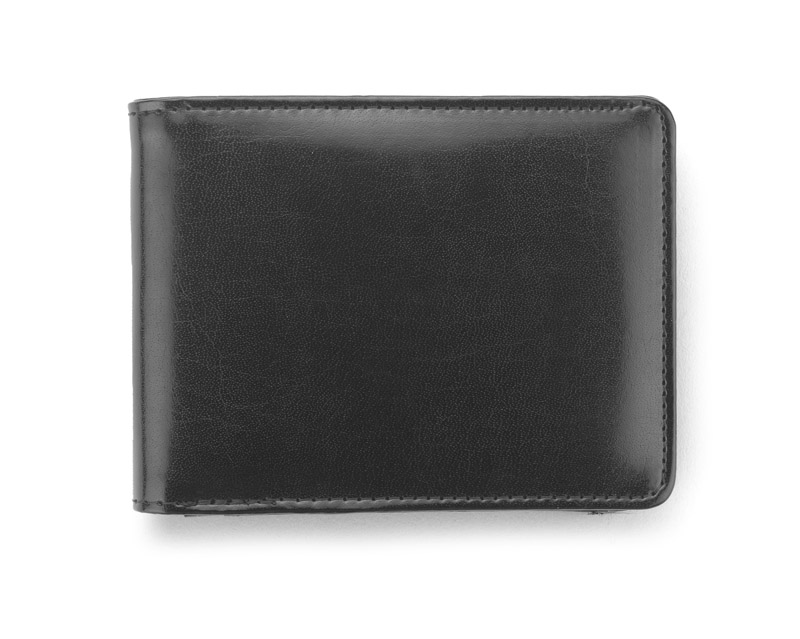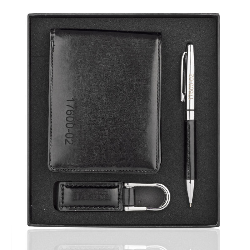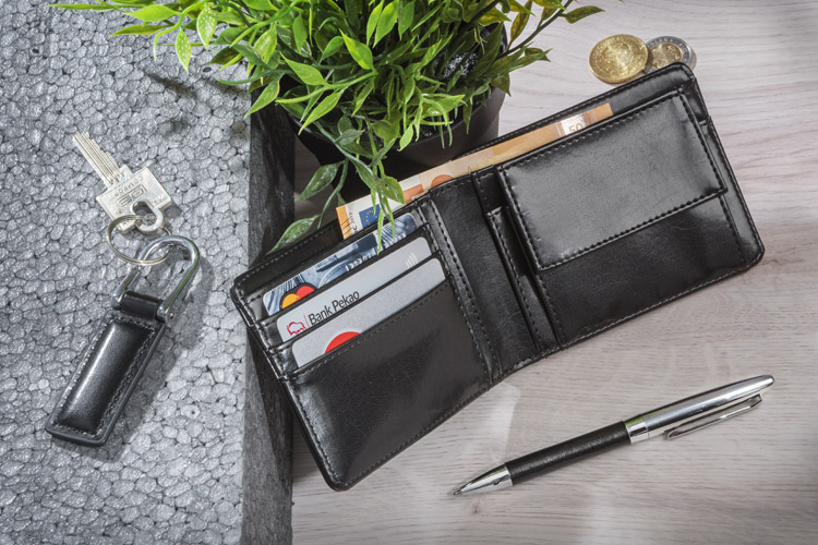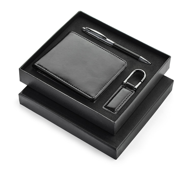 Gift set consisting of a wallet, a keychain and a metal ball pen. The wallet is made of eco-leather containing 2 bill compartments, a pouch for coins and additional pockets for e.g. credit cards or receipts. All elements are packed in a stylish black box. We might engrave a logo on each element separately as well as on the box.