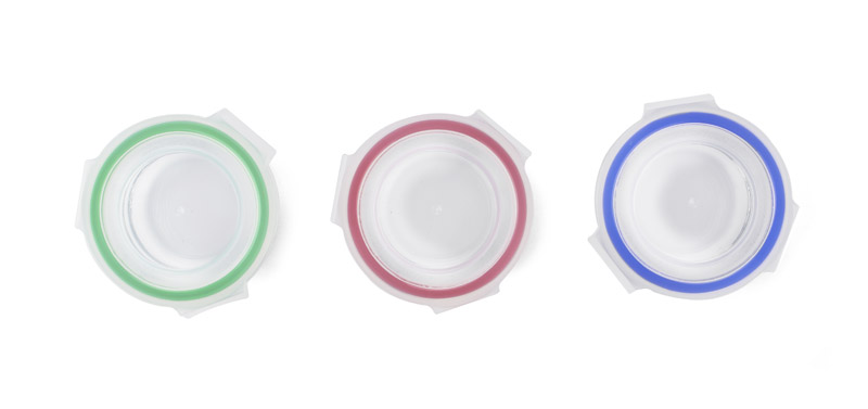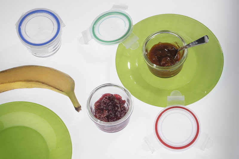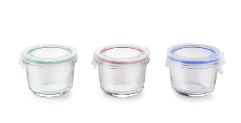 The PESTO set contains 3 borosilicate glass jars with a transparent lid closed with 3 hooks. Each cover has a gasket in a different color. They can be used to store food and heat food at high temperatures. The capacity of one jar is 120 ml.