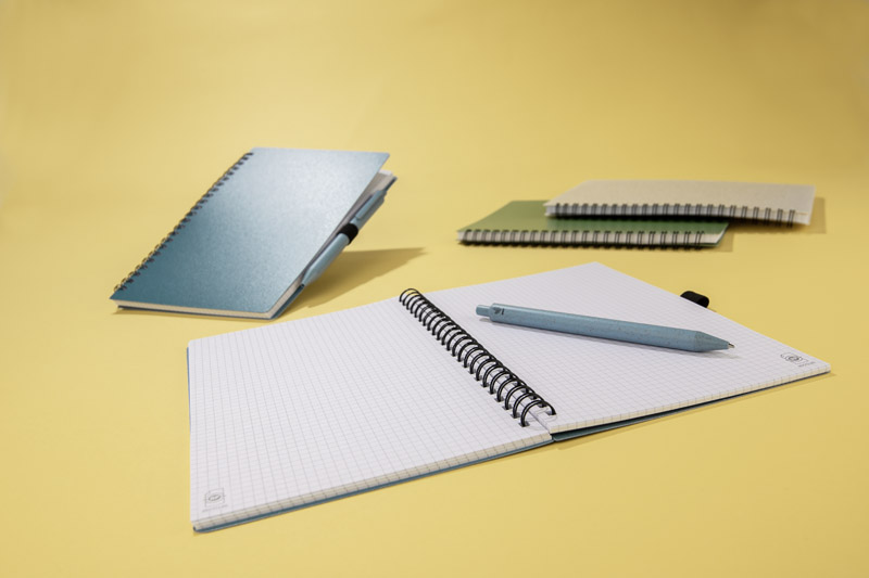TRESA notebook with a pen, colour-matched to the cover. The pen and cover of the notebook are made from wheat straw. Spiral-bound notebook with 70 sheets of checked, recycled paper. Format A5. Ballpoint pen refill in blue.