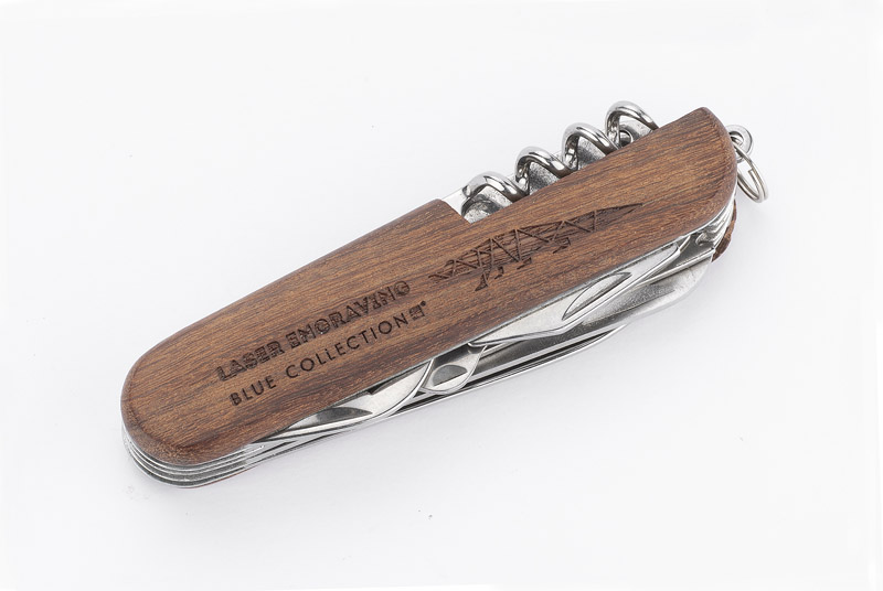 A pocket knife with wood-finished handle – unique character combined with eye-cathing look. This gadget have all necessary features: knife, saw, fish scrapper, scissors, can opener, bottle opener, screwdriver, corkscrew, awl and leather punch.