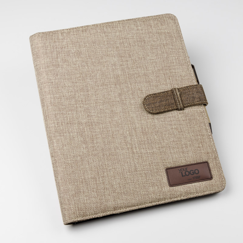 Eco portfolio made from cotton linen fabrics. Includes 2 huge pockets, 2 places for USB memory sticks, small pockets, ball pen, notebook. Notebook is not stuck to the cover, but only slid on the pocket, which makes it possible to change the notobook. Logo may be engraved on the ecoleather sewn in the cover.