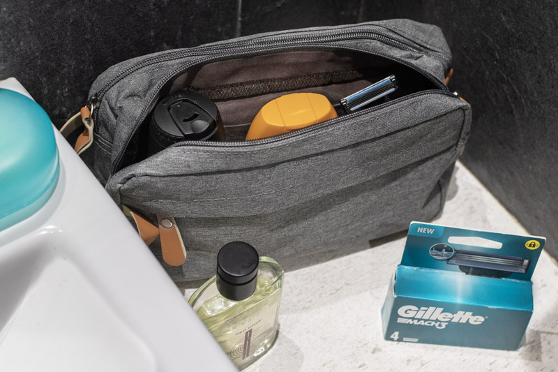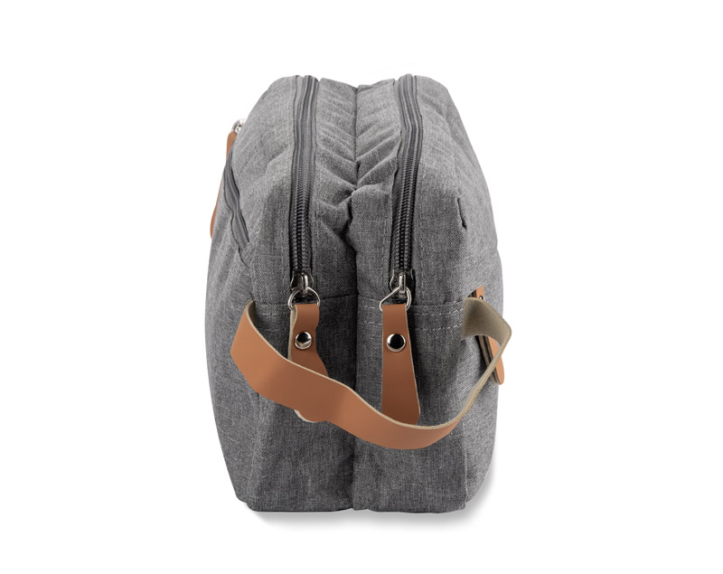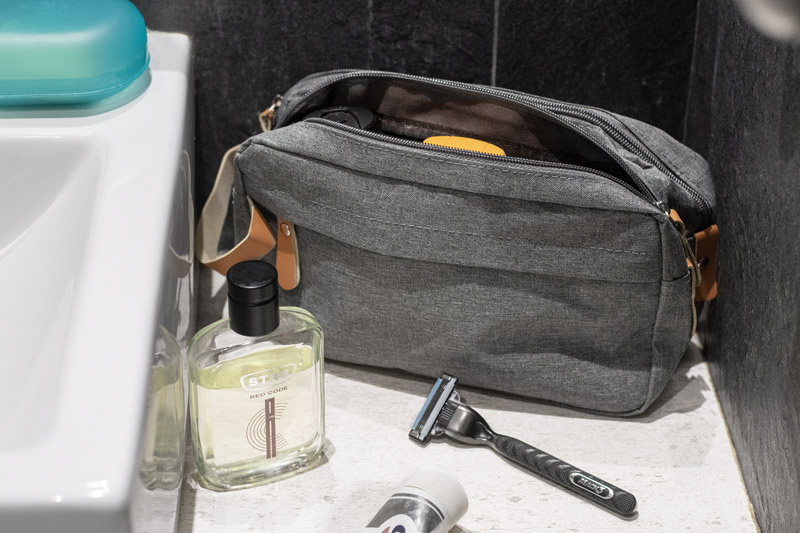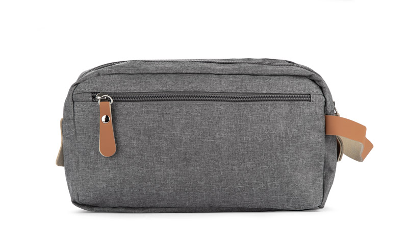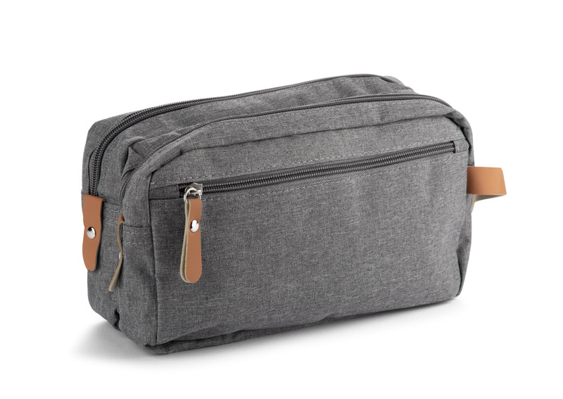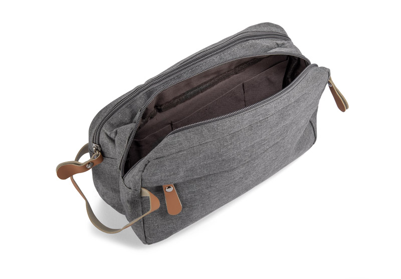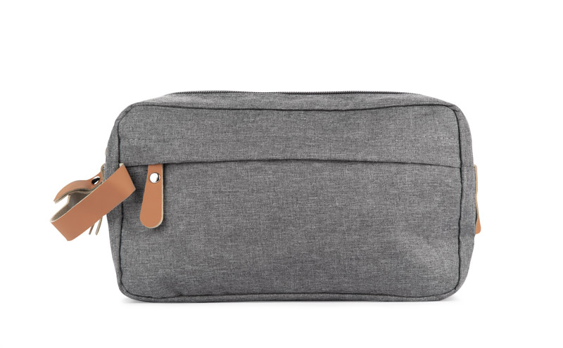 Vacation? Business trip? Weekend getaway? The NASLI cosmetic bag is a must-have for any journey. Spacious and practical, it features two separate zippered compartments and plenty of smaller pockets to keep all your toiletries organized.What makes NASLI stand out? Its stylish, ash-grey color gives it a universal, unisex appeal, making it perfect for both men and women. Plus, the melange texture helps hide any potential stains, keeping it looking fresh on every trip.The eco-friendly brown leather accents on the zippers and handle add a touch of elegance and make NASLI truly unique.