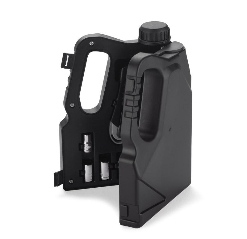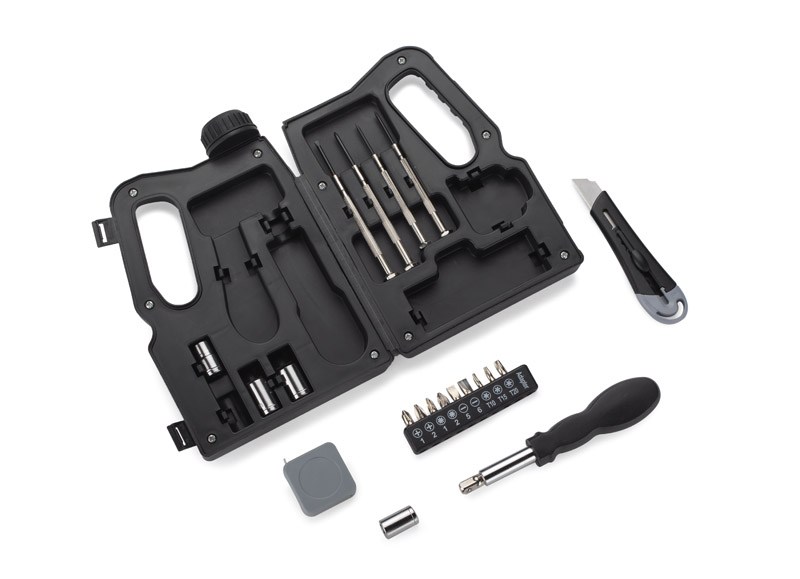 The KANNIS is a set that contains many useful tools: four precision screwdrivers, a wallpaper cutter, a coiled tape measure, a handle, four socket spanners with adapters and nine bits. Everything together is enclosed in a distinctive canister-shaped case.