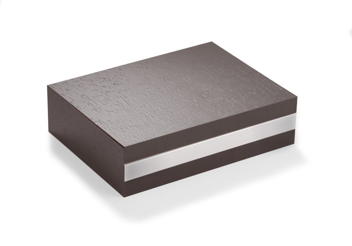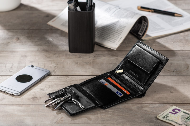 Leather wallet containing a pocket for coins, 2 pockets for notes, 4 holes for credit cards and 5 pockets for the documents and one zipped pocket. The wallet is packed individually in a wooden box. Additionally the wallet has a protective film blocking RFID signal, which prevents from stealing data from credit cards.