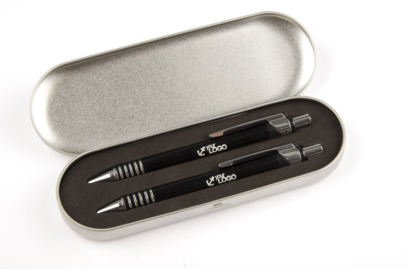 DAKOTA writing set contains a ball pen and automatic pencil. Both packed in a handy metal case. Logo might be engraved on both the package and the set.