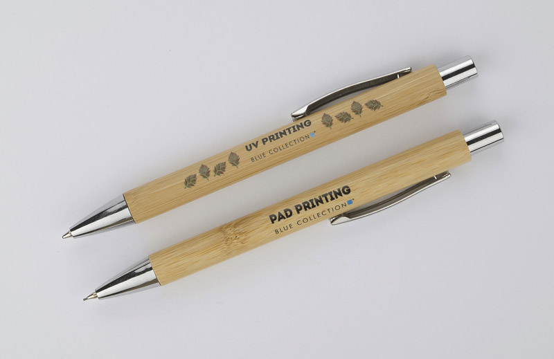 The MAMBOO writing set consists of a pen and an automatic pencil, packed in a brown eco-friendly cardboard box. The body of both pen and pencil is made of natural bamboo. Chrome finish gives it elegance. Blue pen refill, mechanical pencil 0.7 mm thick.
